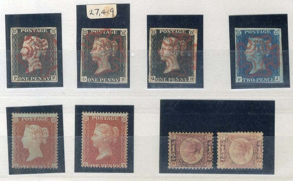 A group of Line Engraved values with 1840 One Penny Black Plate Ia: PF in a lighter shade, small to good margins with a good strike of dark red Maltese Cross, Plate III: GB, close to good margins and crimson-red Maltese Cross (B.P.A. Certificate), Plate VI: QH, good to large margins showing hair on plate variety with red Maltese Cross (slight thinning at left); 1840 Two Pence Plate 2, FJ in pale blue with a fine and central strike of red Maltese Cross, close to large margins (light horizontal crease); 1d. Stars Small Crown, perf.16, dies I and II unused; and 1870 ½d. plates 5 and 11 unused. Attractive. (8)