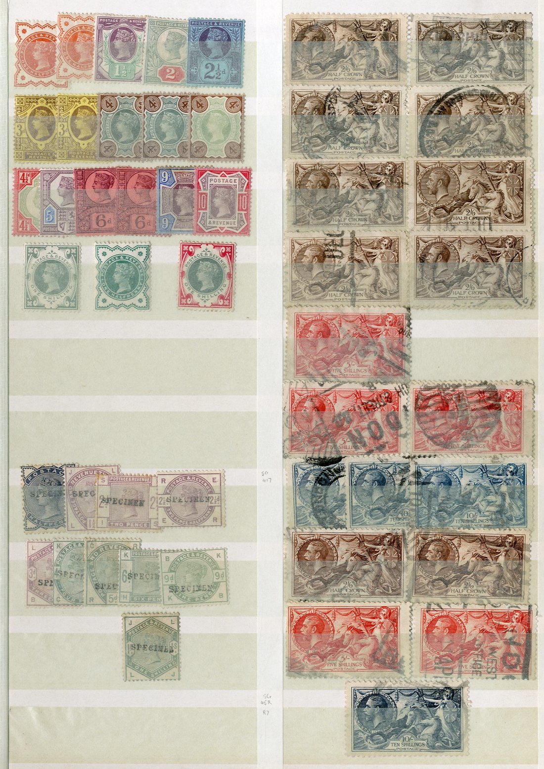 1847-1959 mint and used selection housed in a red stockbook, hundreds, including 1867-83 watermark Cross 5/- (2), £1, 1883 or 1884 ½d. to 1/- handstamped "specimen", 1887-92 1/-, £1, 1900 1/-, Edwards with values to 10/- and £1, 1925 Wembley set (2), 1929 P.U.C. £1, 1934 re-engraved 2/6d., 5/- and 10/-, 1939-48 set, 1948 Wedding £1, 1951 2/6d. to £1, mixed condition