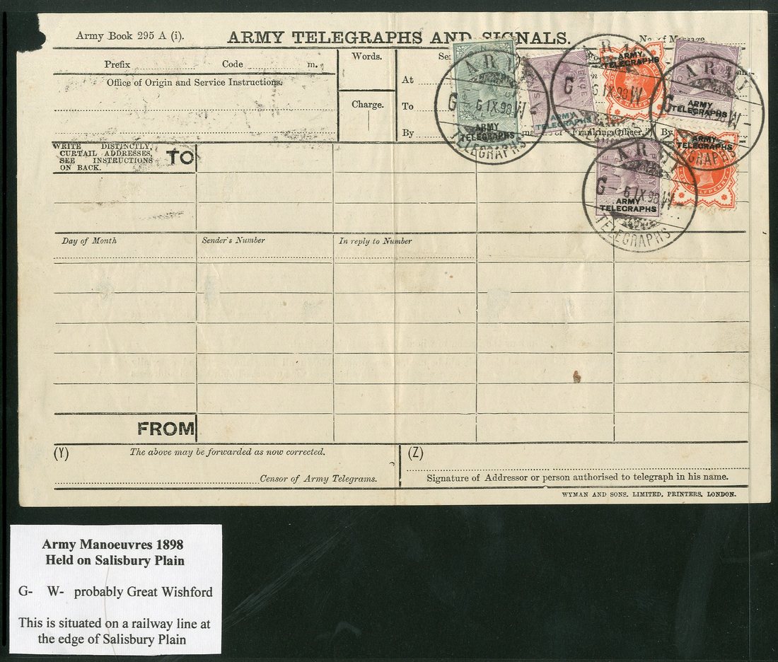 1898 blank "army telegraphs and signals" form, bearing 1888 ½d. vermilion (2), 1d. lilac and green (2), 6d. lilac and green and 1/- green and black, each cancelled by "GW" (Great Wishford) "army/ telegraphs" cancellations, the form itself with surface thins, the stamps fine. Offered with copies of a map and illustrations depicting the exercise.