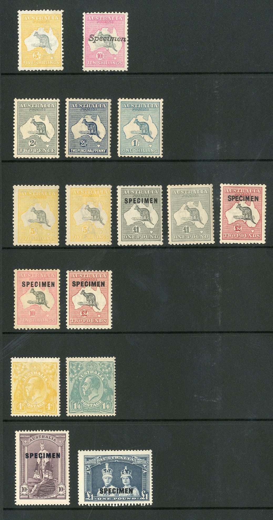 A mint range of mainly Kangaroos comprising 1913 1st. wmk. 5/- with broken tail and 10/- handstamped "Specimen" (pulled perf at left), 1915 2nd. wmk 2d. (slightly gum toned), 2½d. and 1/- (slightly gum toned), 1915-27 3rd. wmk 5/- (2, one centred to right), £1 grey (2, one gum toned, the other overprinted "specimen" - (Type C) and £2 grey-black and crimson overprinted "specimen" (Type B - tiny thin and slightly gum toned), 1929-30 small multiple wmk. 10/- overprinted "specimen" (Type C1a variant; thin and soiled) and £2 overprinted "specimen" (Type D), also KGV Head 1914 4d. lemon-yellow, 1927 small multiple wmk., perf 14 1/4d. and 1938 Robes10/- and £1 (gum disturbed) overprinted "specimen". Condition mixed