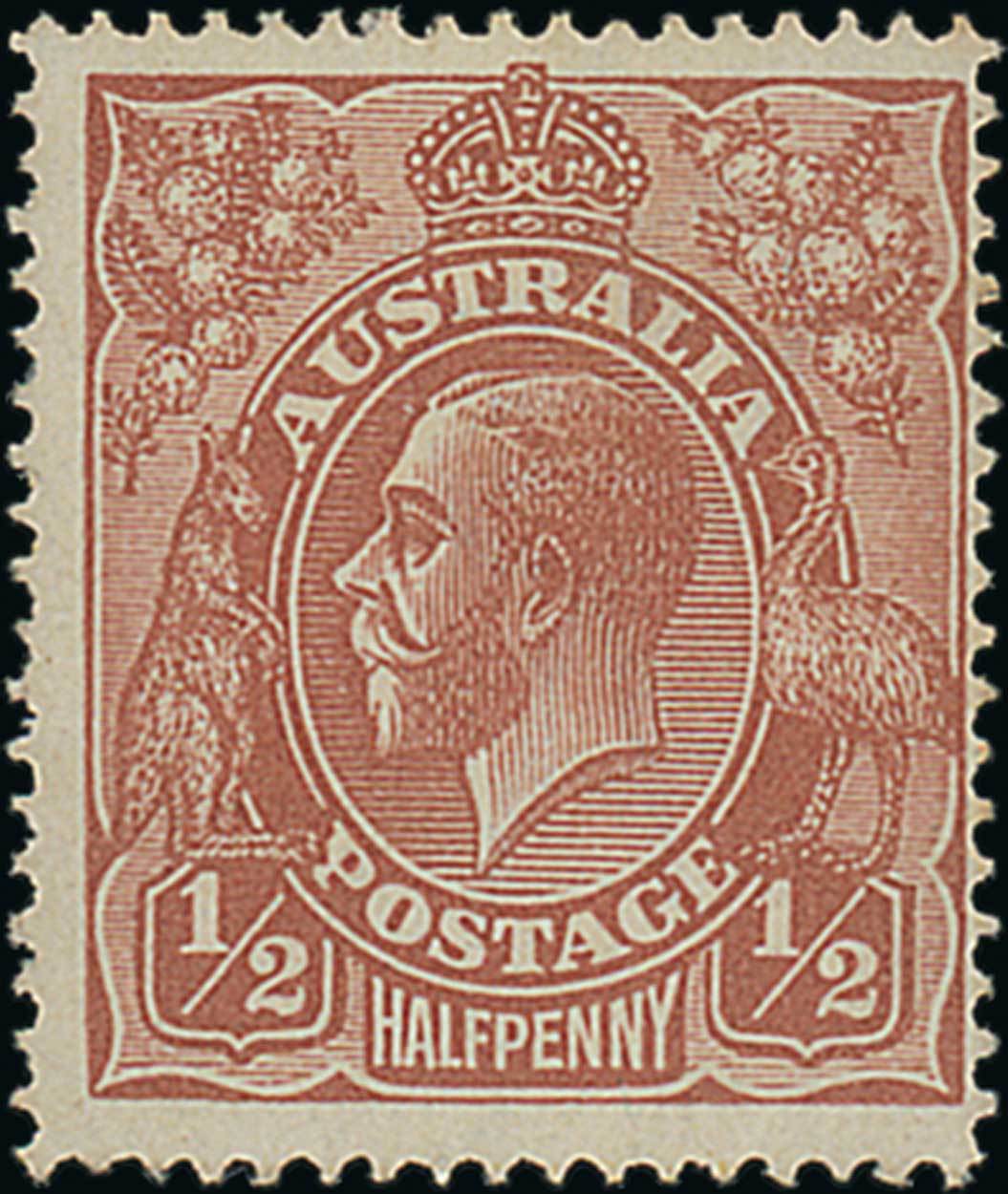 1922 single watermark, comb perf. ½d. colour trial in red-brown on ungummed paper, centred to right, very fine. Extremely rare, only two examples have known to survive of the seven printed. BW 66PP(1), $40,000. Photo