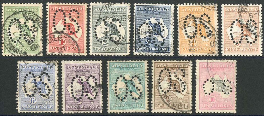 1913 1st. wmk., large "OS" ½d. to 2/- less 3d. plus 1915-28 3rd. wmk 10/-, all used with c.d.s., generally fine. Cat. £600+