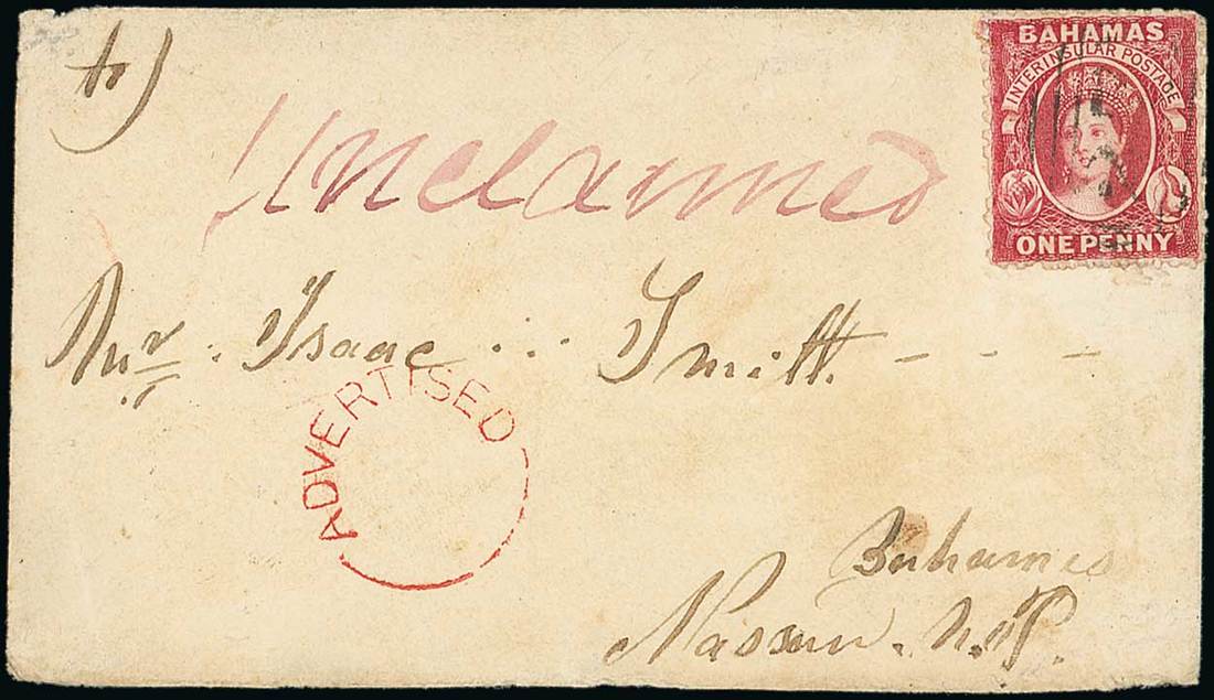 1867 (Aug.) envelope from an Out Island to Nassau, bearing 1863-77 1d. carmine-lake cancelled "27" and with manuscript "Unclaimed" and single-ring "advertised", both in red, part New Providence datestamp on reverse. Photo