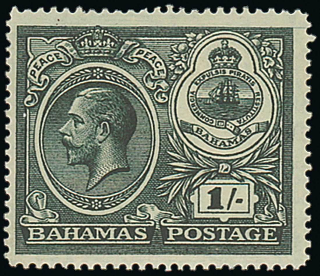 1920 Peace Celebration 1/- green, variety substituted Crown in watermark, original gum, light diagonal gum bends, fine and scarce. S.G. 110a, £1,800. Photo