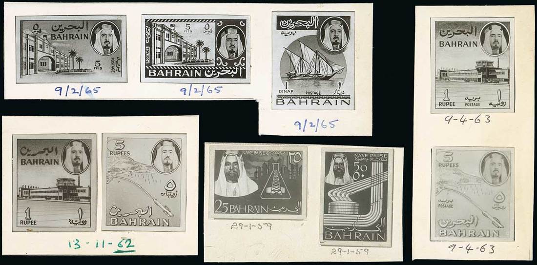 1959-65 selection of contemporary photographs from the printer's record books mounted on card comprising unissued 1959 (29 Jan.) Petro-Chemical 25n.p., 50n.p., and 1964 1r. (2), 5r. (2), each with subtle differences to issued design, 1965 (9 Feb.) 5f., two different designs, 1d., all unadopted. Fine and probably unique. (7). Photo