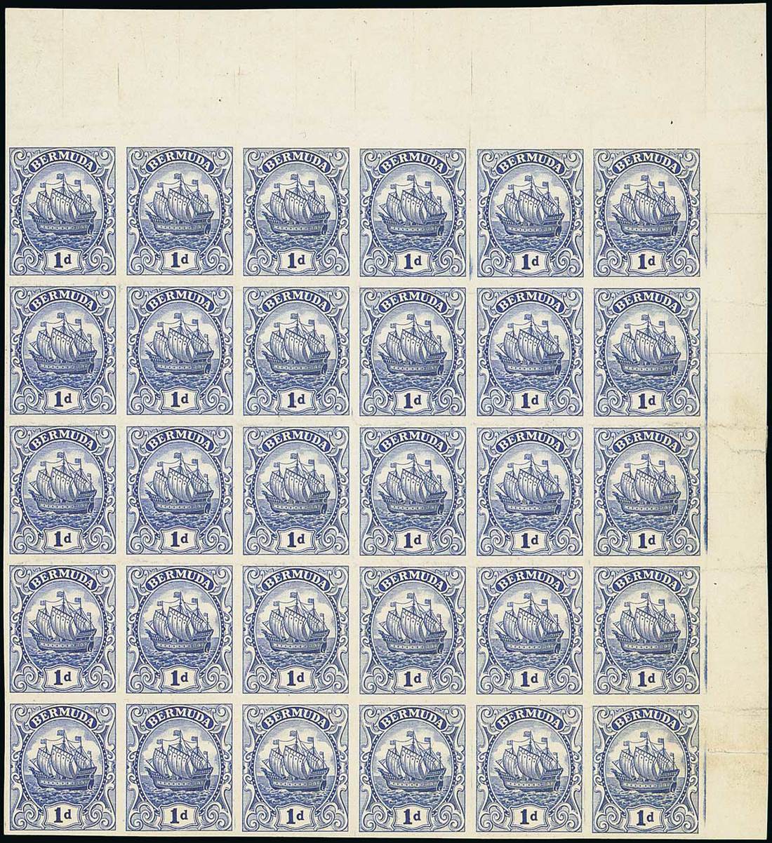 1923-34 Caravel 1d. type III, imperforate colour trial in blue, block of thirty (6x5) from the upper right corner of the sheet on thick, ungummed and unwatermarked paper, creased, mostly at foot; fine. A marvellous exhibition piece. S.G. 79P. Photo