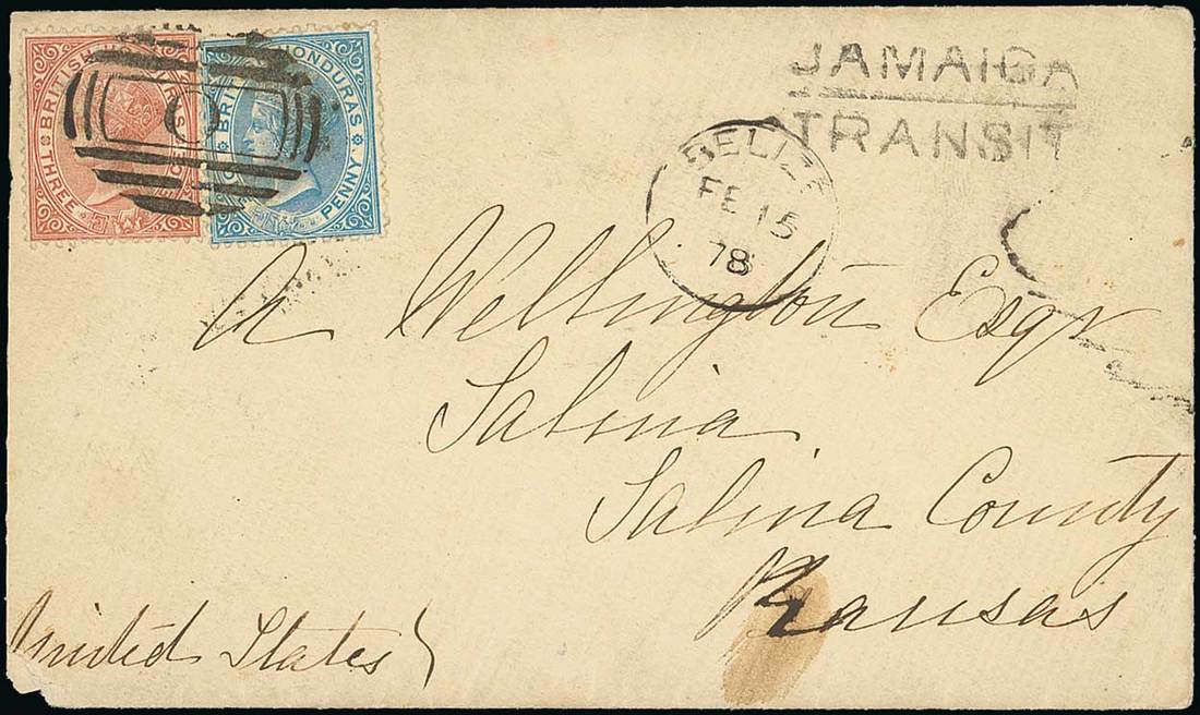 1878 (15 Feb.) envelope to Kansas, bearing 1872-79 perf. 14 1d. blue and 3d. chestnut tied by a single "O" in oval of bars cancellation, Belize c.d.s. and "jamaica/transit" alongside, transit and arrival markings on reverse; the envelope with small fault at lower left but pre 1880 covers are extremely rare. S.G. 12, 13. Photo