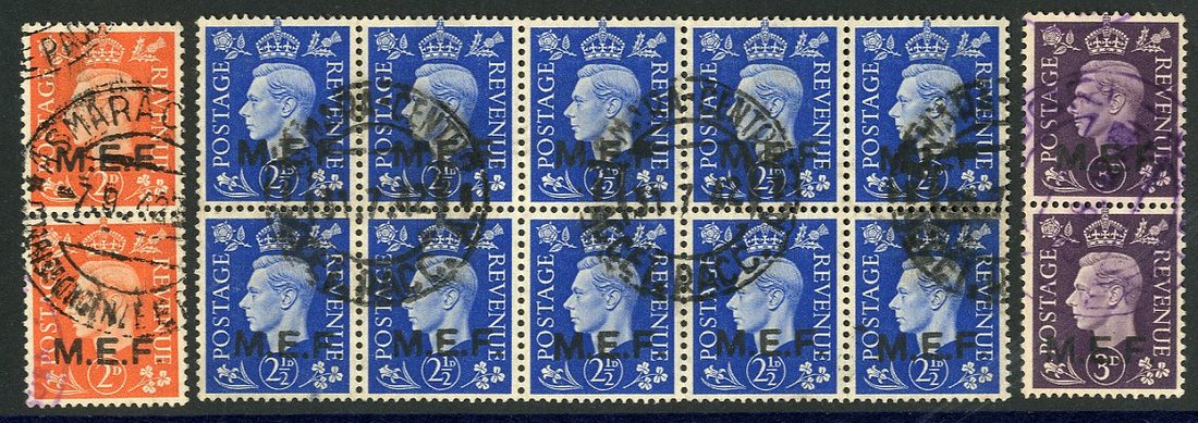 1942 overprint 13½mm., round stops, 2d. orange vertical pair (creased), 2½d. block of ten (5x2), 3d. violet vertical pair one with square stops, chiefly fine. S.G. M7a, M8a, M9b, £725