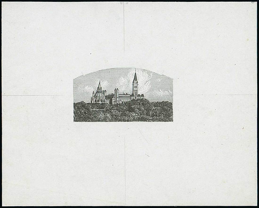 1933 U.P.U. Congress 5c., essay die proof of the vignette in an unissued design showing the main building and library only, in black on glazed wove paper (82x65mm.) with guide lines on all four sides; unobtrusive crease at lower left and small thin at top, clear of the design. Rare. Photo