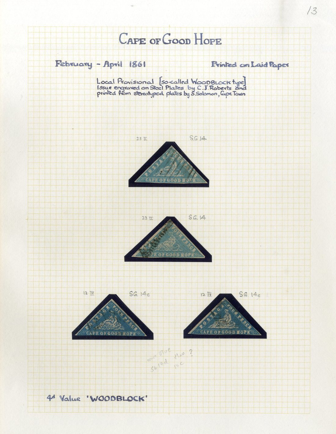 1853-83 a mostly used collection neatly written-up in an album including 1853 paper deeply blued, 4d. (3), paper slightly blued 1d. (2, plus a pair and one unused), 4d. (3), 1855-58 1d. deep rose-red (3, one unused), 4d. (18, one on piece and one on 1858 entire, plus two pairs), 6d. pale rose-lilac (3), 6d. deep rose-lilac pair, 6d. slate-lilac (2), 1/- bright yellow-green (5) and 1/- deep dark green, 1858 unofficially rouletted, 6d. (B.P.A. Certificate states "used with blind roulettes at left is genuine as far as one may say"), 1861 'Woodblock' 1d. vermilion, 4d. pale milky blue (2) and 4d. deep bright blue (2), 1863-64 1d. deep carmine-red (4 including a pair), 4d. deep blue (3 including a pair), 4d. blue (7, one mint), 4d. slate-blue and 4d. steel-blue, 6d. (3, one mint plus a mint marginal pair), 1/- (3), 1883 Official reprints 1d. (2), 4d. (2); selection of forgeries (23) plus a entire with forged postmark; also stampless entires (11). Condition mixed with some fine. A very interesting lot. (112 items)