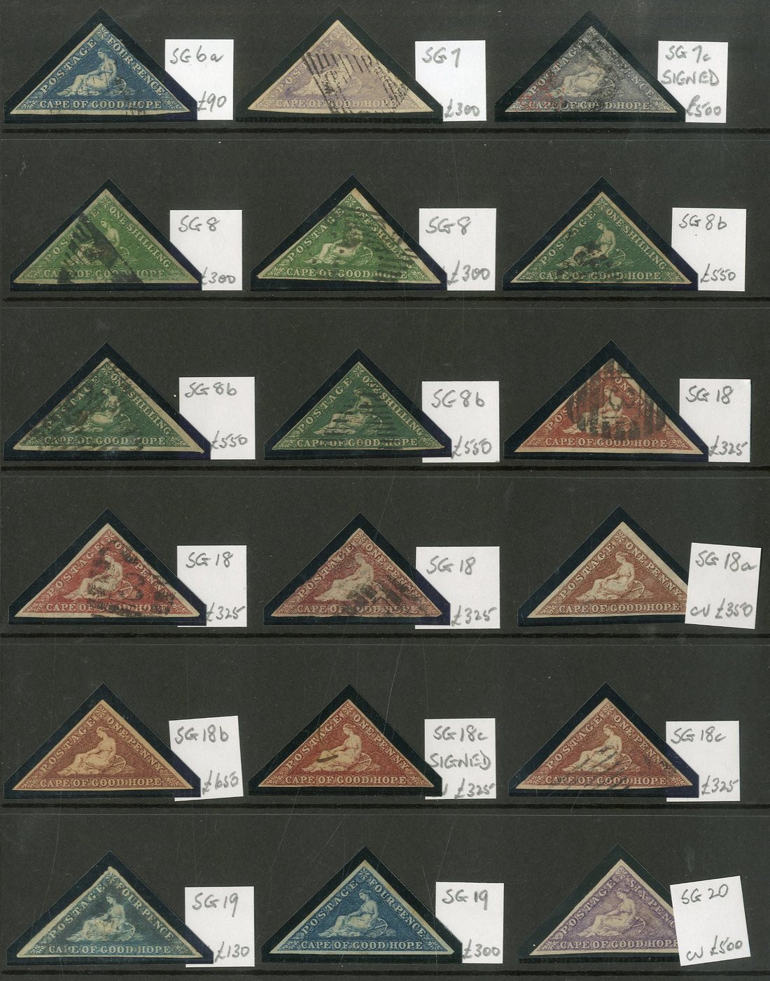 1853-64 used selection comprising 1853 1d. (2) and 4d. (4), 1855-63 1d. (4), 4d. (7, one on 1861 front and part back from Aliwal to Mossel Bay), 6d. rose-lilac, 6d. slate-lilac, 1/- yellow-green (2), 1/- deep green (3), and 1863-64 1d. (7, two unused) and 4d. (3, one with watermark sideways and one used) and 6d. (unused), some with margins all round; a few faults in places, some of good appearance. Cat. c. £10,900