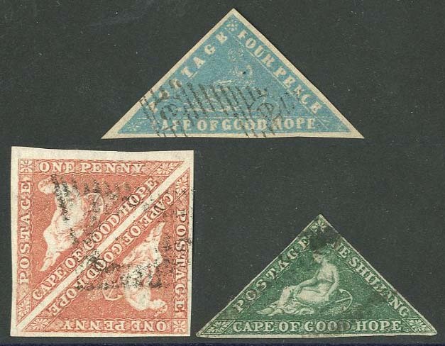 1853 paper slightly blued, 1d. brick-red pair with good to large margins, lightly cancelled, blueing washed out, 1855-63 white paper 1/- deep dark green with small to good margins, a little heavily cancelled in places, small corner crease and tiny repaired tear towards top right, and 1861 "Woodblock" 4d. blue with good margins and lightly cancelled though repaired at foot (PFSA Certificate 1985). S.G. 3, 8b; 14d; £4500
