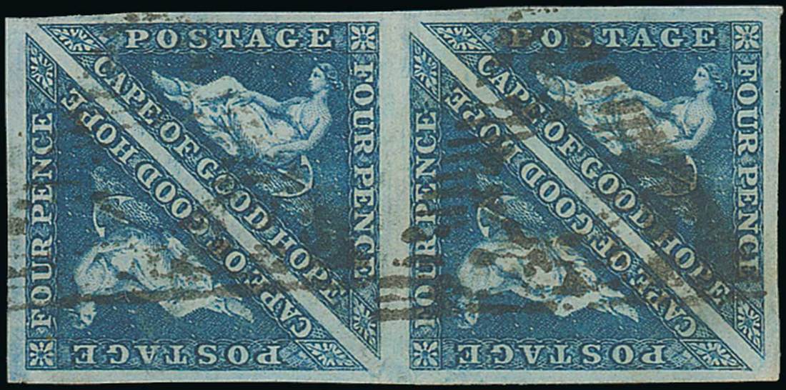 1853 slightly blued paper, 4d. deep blue block of four with watermark sideways, good to large margins, cancelled by triangular obliterator; tiny natural inclusion. Fine colour. S.G. 4b, £1,500. Photo