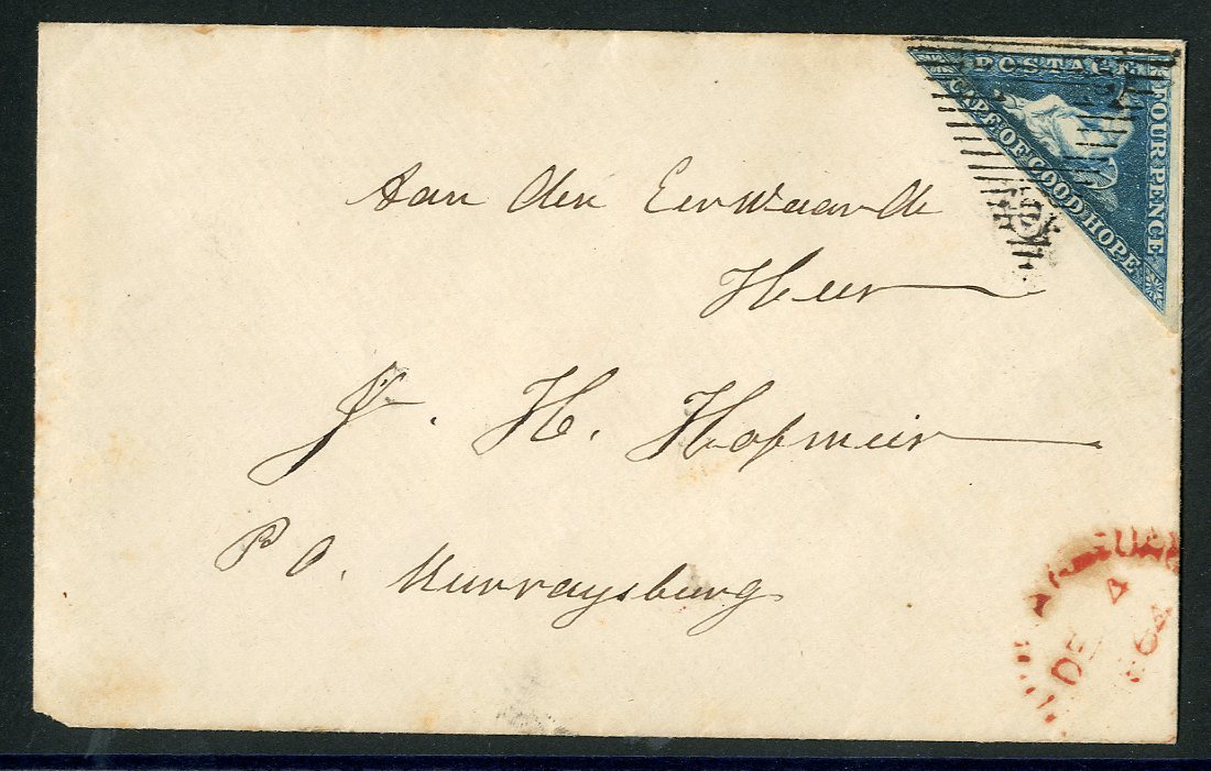 4d. blue, large margins, well tied on 1864 (4 Dec.) envelope from Victoria to Murraysburg, showing part arrival c.d.s. in red at lower right with arrival d.s. on reverse, fine. S.G. 6a