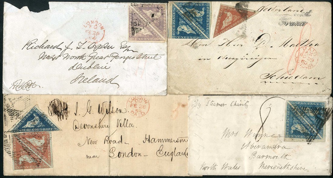 1857-64 selection of seven envelopes, mostly from Cape Colony to Great Britain with five franked at 6d. (one with 1d. pair plus 4d. and one a double 6d.), one with 1d. and 4d. pair to Holland and one with 4d. pair to Wales; condition mixed with most stamps cut-into and envelopes with faults