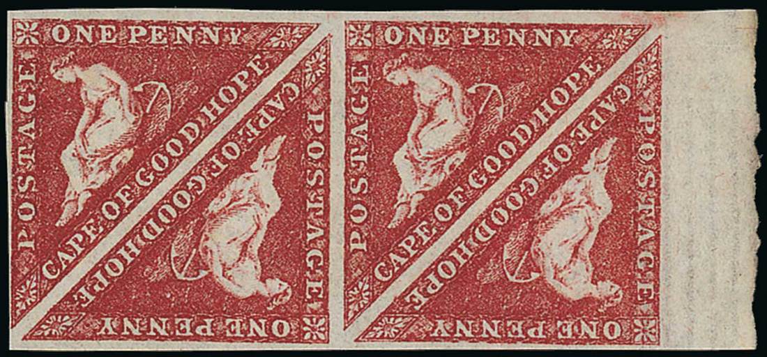 1d. deep carmine-red marginal block of four, unused with close to large margins, unused with large part original gum, fine. P.F.S.A. Certificate (1986). S.G. 18, £1,300. Photo
