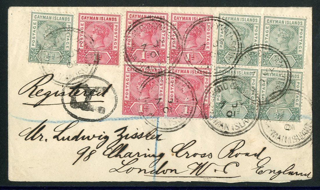 1901 (7 July) "Zissler" envelope registered to London, bearing 1900 ½d. and 1d. a single and block of four of both, all cancelled by "grand cayman/cayman islands" double-ring d.s., showing "R" in oval and, on reverse, Jamaica Registered (18.7) and arrival (2.8) datestamps; the lower pair in both blocks crossed by blue crayon. The earliest recorded registered cover using Cayman Islands stamps