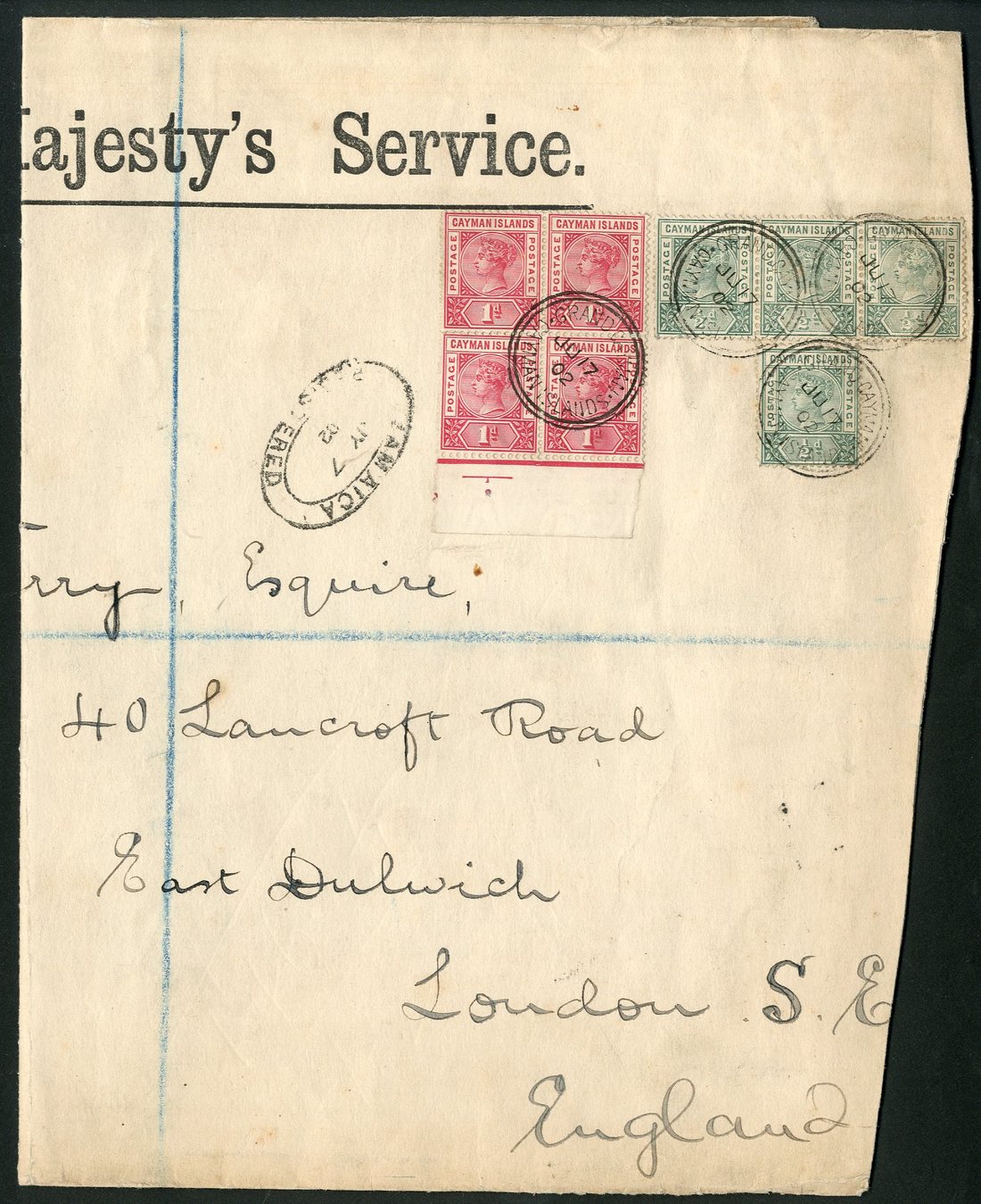 1902 (17 June) OHMS envelope (345x230mm; showing "er" of "Her" deleted and manuscript "is" written above) registered to London, bearing 1900 ½d. strip of three and single plus 1d. marginal block of four, all cancelled by "grand cayman/cayman islands" double-ring d.s., showing "R" in oval, Jamaica Registered transit d.s. (7.7) with arrival d.s. (23.7) on reverse; the envelope (Arms of Jamaica on flap) slightly truncated at right, folded and with some other lesser faults. A spectacular usage. Photo