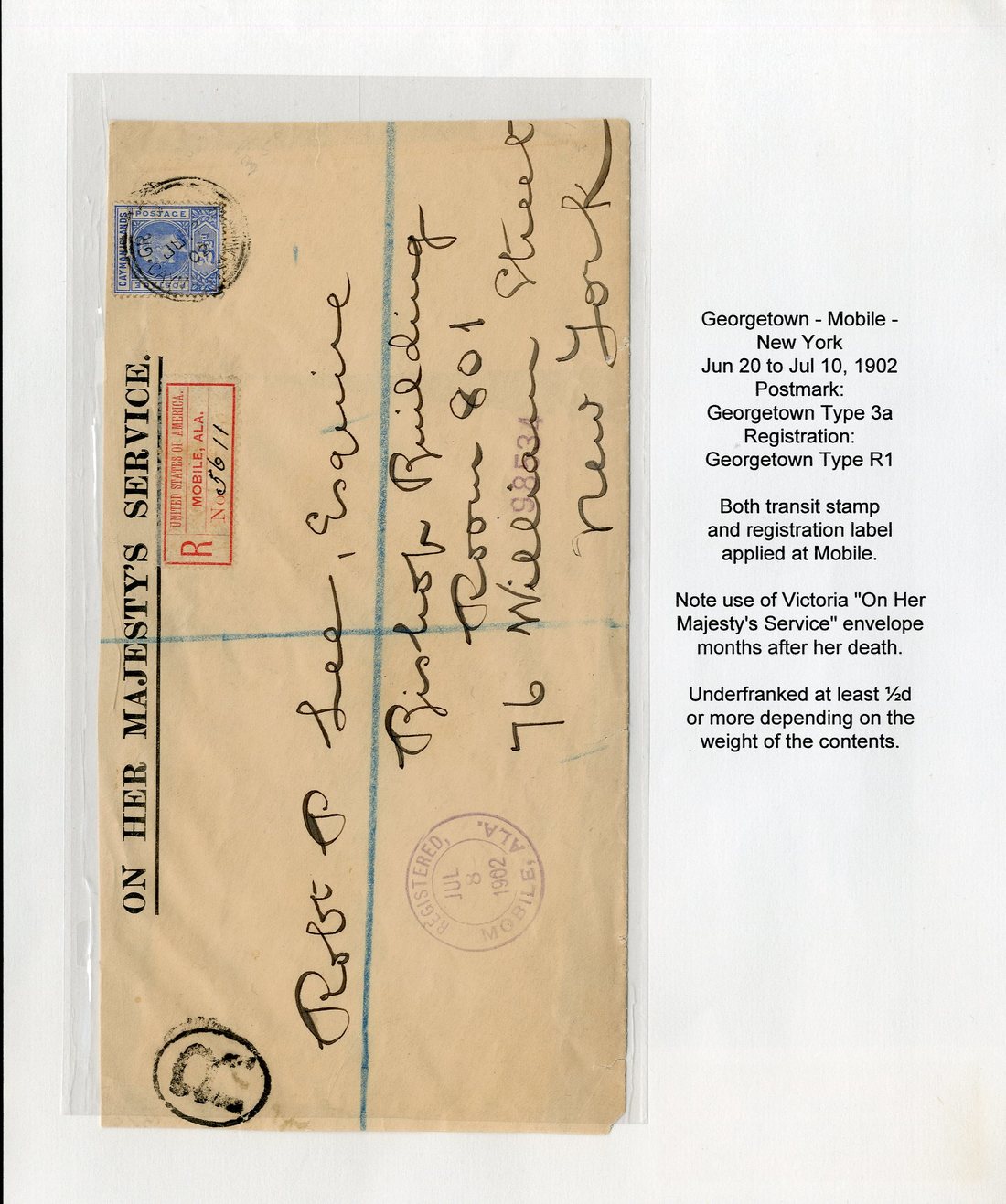 1902 (20 June) OHMS envelope (opened-out) registered to New York, bearing 1902 2½d. tied by "grand cayman/cayman islands" double-ring d.s., showing "R" in oval, red Mobile registration label and violet Registered c.d.s. with arrival d.s. (10.7) on reverse; the envelope slightly truncated at ends