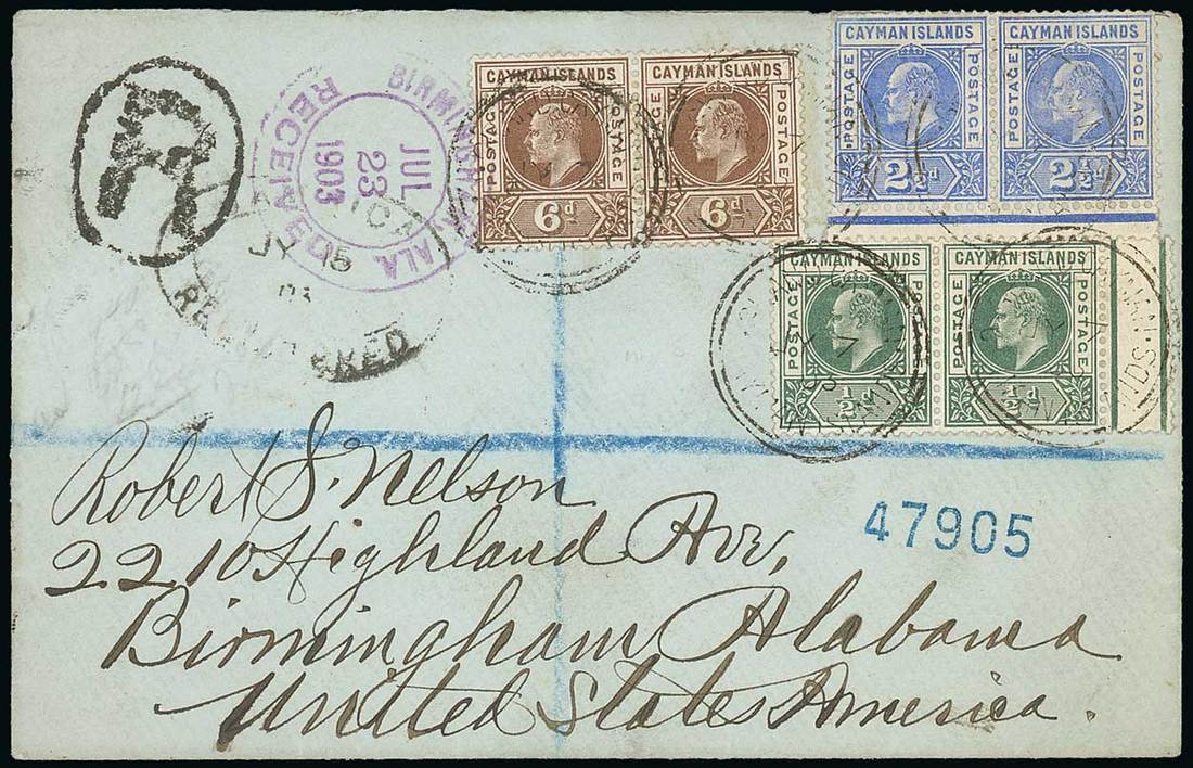1903 (7 July) envelope registered to Birmingham, Alabama, bearing 1902 ½d., 2½d. and 6d. pairs, all tied by "grand cayman/cayman islands" double-ring d.s., showing "R" in oval, Jamaica Registered (15.7) and arrival (23.7) datestamps with New York transit d.s. (21.7) on reverse. A fine commercial franking. Photo