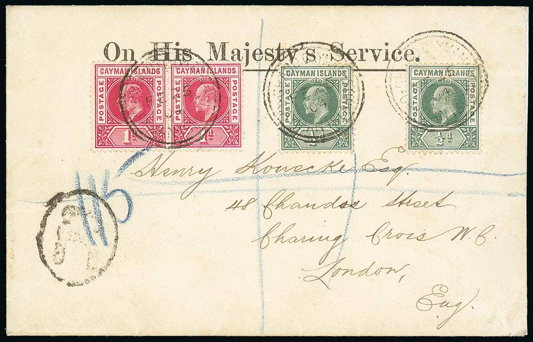 1904 (25 Feb.) OHMS envelope registered to London, bearing 1902 ½d. (2) and 1d. pair, each tied by "grand cayman/cayman islands" double-ring d.s., showing "R" in oval with arrival datestamp (24.3) on reverse. Attractive. Photo