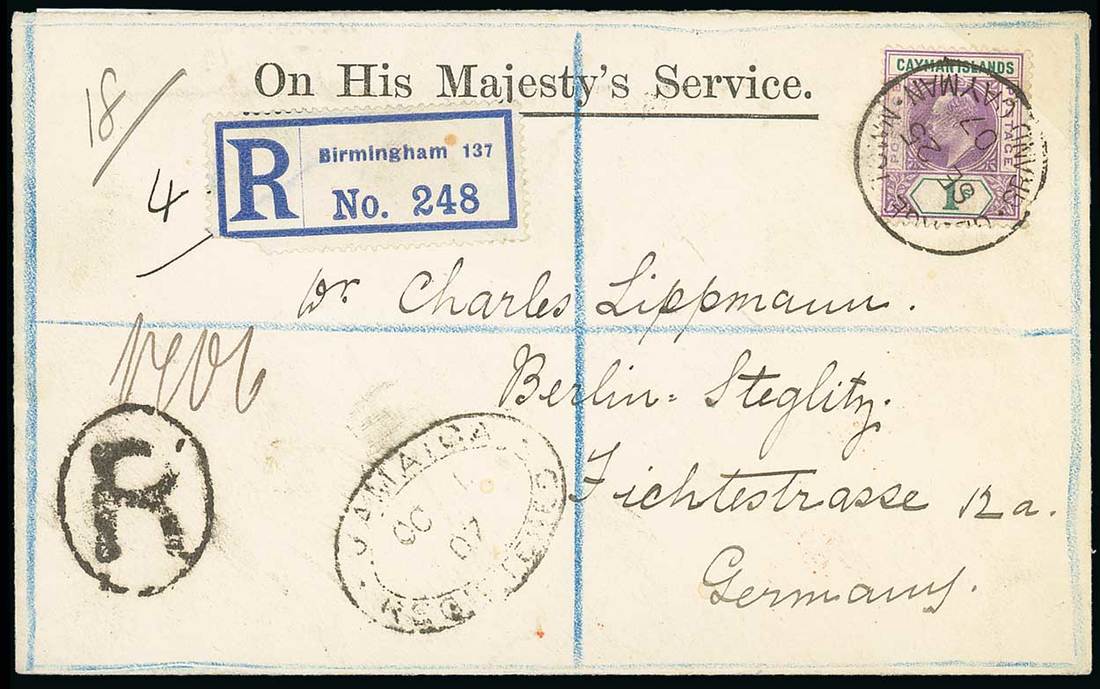 1907 (25 Sept.) OHMS envelope registered to Germany, bearing 1907 1/- tied by "george town/grand cayman" c.d.s., showing "R" in oval, Jamaica Registered transit d.s. (1.10), Birmingham UK registration label and, on reverse, London (15.10) and arrival datestamps. Photo