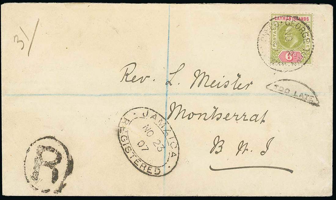 1907 (9 Nov.) envelope registered to Montserrat, bearing 1907 6d. tied by "george town/grand cayman" c.d.s., showing "R" in oval, Jamaica Registered transit d.s. (23.11) along with Jamaica "too late" h.s. and arrival c.d.s. (28.12) on reverse. A very unusual inter-island use. Photo