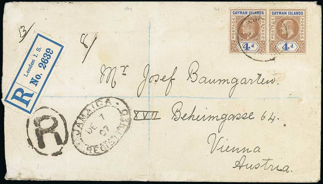 1907 (28 Nov.) double rate envelope registered to Vienna, bearing 1907 4d. pair tied by "george town/grand cayman" c.d.s., showing "R" in oval, Jamaica Registered transit d.s. (7.12), London I.S. registration label and, on reverse, London (24.12) and arrival (27.12) datestamps; the envelope with two light vertical folds. A fine commercial usage being 1d. overpaid at a time when low values were in short supply. Photo