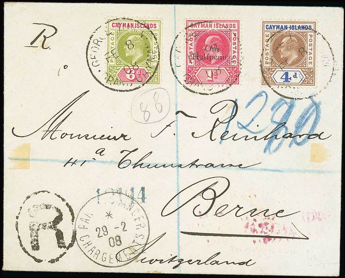 1908 (8 Feb.) envelope registered to Switzerland, bearing 1907 (Aug.) "One/Halfpenny" on 1d. with 1907 (Mar.) 4d. and 6d., all clearly tied by "george town/grand cayman" c.d.s., showing "R" in oval with Paris Estranger transit d.s. (29.2) alongside. Rare. Photo