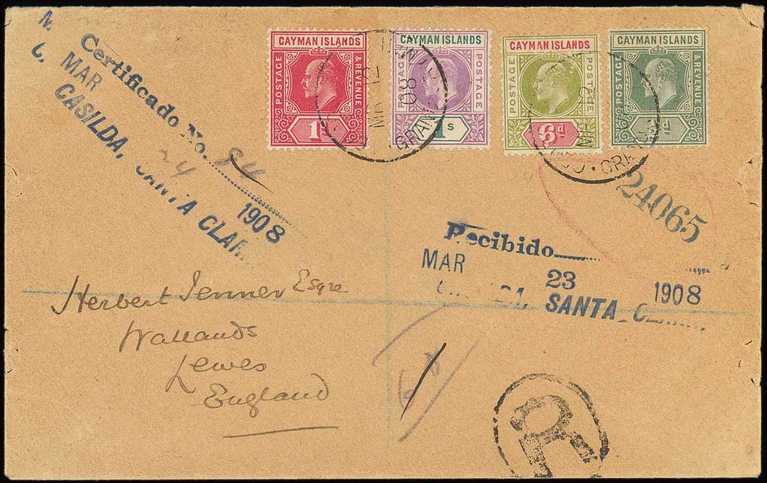 1908 (12 Mar.) envelope registered to England, bearing 1907 (Mar.) 6d. (minor surface scuffs) and 1/-, and 1907-09 ½d. and 1d., all tied by "george town/grand cayman" c.d.s., showing "R" in oval and blue Cuban transit registration h.s. with, on reverse, Havana (25.3), London (7.4) and arrival datestamps. Most attractive. Photo