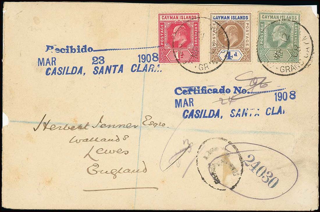 1908 (12 Mar.) envelope (opened-out) registered to England, bearing 1907 (Mar.) 4d. and 1907-09 ½d. and 1d., all tied by "george town/grand cayman" c.d.s., showing "R" in oval and blue Cuban transit registration h.s. with, on reverse, Havana (25.3), London (7.4) and arrival datestamps; the envelope with small piece missing at left and at top right. Most attractive. Photo