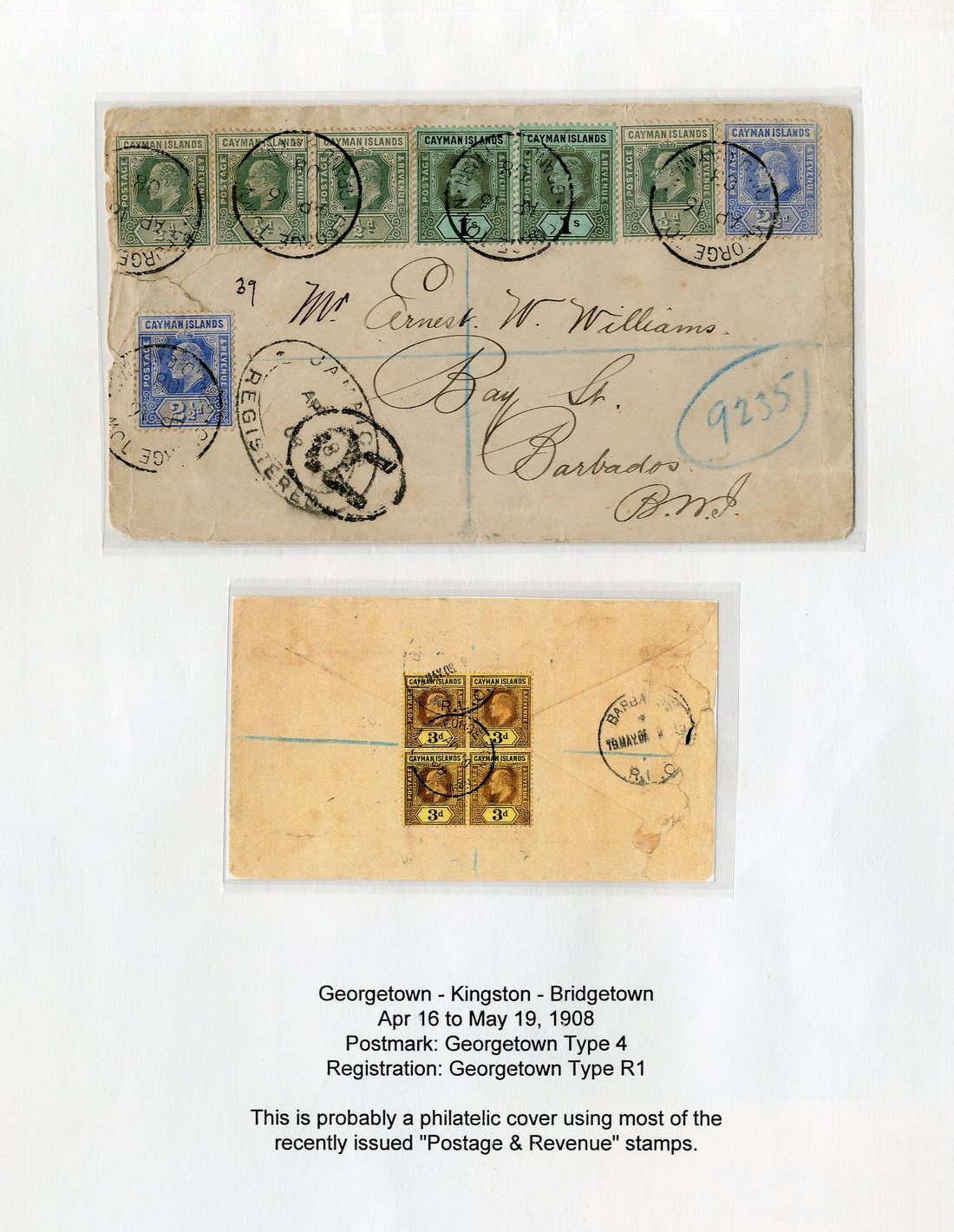 1908 (16 Apr.) envelope registered to Barbados, bearing 1907-09 ½d. (4), 2½d. (2), 3d. block of four (on reverse) and 1/-, all cancelled by "george town/grand cayman" c.d.s., showing "R" in oval overstruck by Jamaica Registered transit d.s. (18.4) with arrival c.d.s. (19.5) on reverse; the envelope with tear at left caused through opening and some slight soiling around adhesives