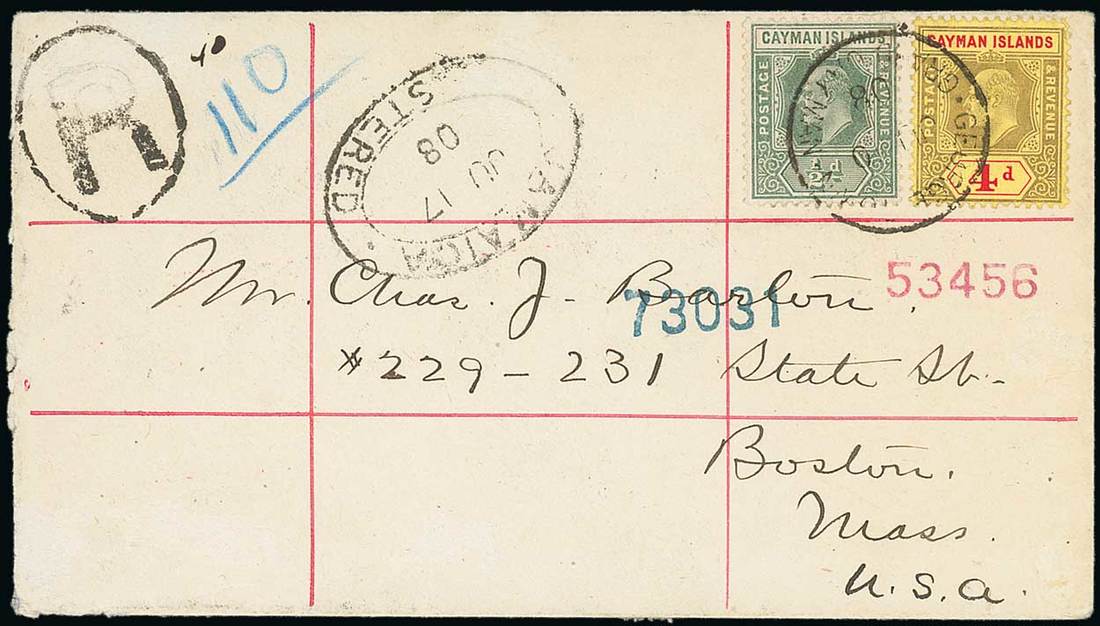 1908 (10 June) envelope registered to Boston Mass., bearing 1907-09 ½d. and 4d. tied by "george town/grand cayman" c.d.s., showing "R" in oval, Jamaica Registered transit d.s. (17.6) and, on reverse, New York and arrival datestamps. Photo