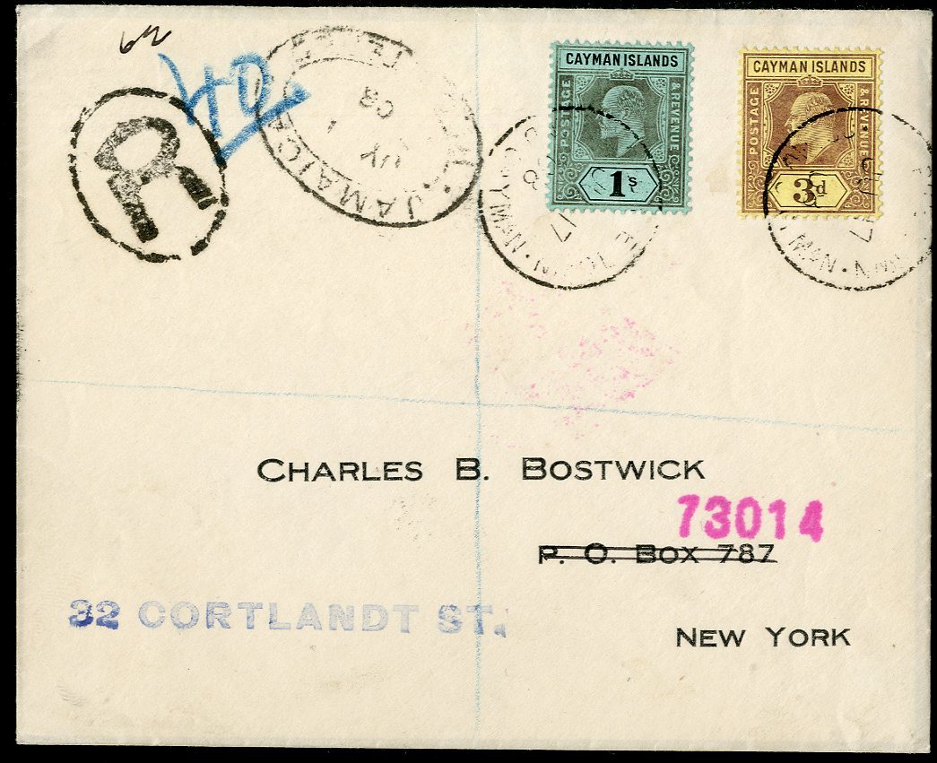 1908 (17 June) envelope registered to New York, bearing 1907-09 3d. and 1/-, both tied by "george town/grand cayman" c.d.s., showing "R" in oval, Jamaica Registered transit d.s. (1.7) with arrival datestamp (8.7) on reverse. Photo