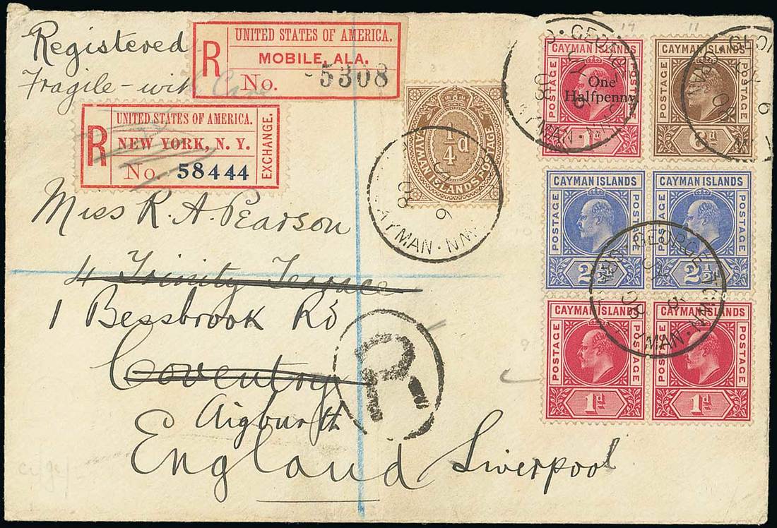 1908 (6 July) envelope registered to Coventry and re-addressed to Liverpool, bearing 1907 (Mar.) 1d. pair, 2½d. pair and 6d., 1907 (Aug.) "One /Halfpenny" on 1d. and 1908 ¼d., all tied by "george town/grand cayman" c.d.s., showing "R" in oval, Mobile and New York Exchange (crossed through) registration labels and, on reverse, Mobile (21.7), New York (23.7) and arrival (3.8) datestamps. A rare and colourful franking. Photo