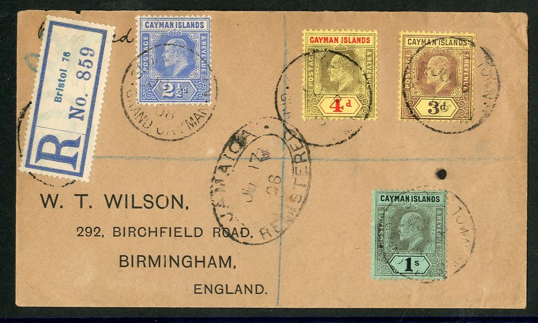 1908 (6 June) "Wilson" envelope registered to Birmingham, bearing 1907-09 2½d., 3d., 4d. and 1/-, each tied by legible "george town/grand cayman" c.d.s., showing "R" in oval obscured by Bristol 76 transit registration label, Jamaica Registered transit d.s. (17.6) with Bristol (1.7) and arrival datestamps on reverse
