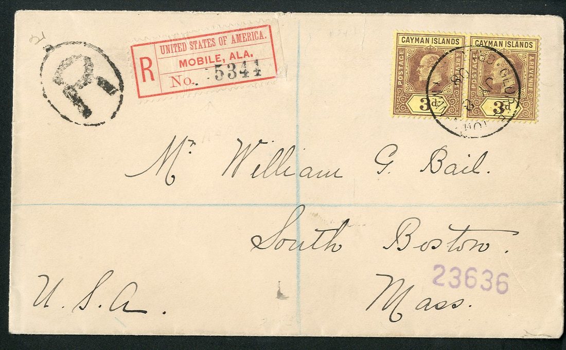 1908 (8 July) envelope registered to Boston Mass., bearing 1907-09 3d. pair clearly tied by "george town/grand cayman" c.d.s., showing "R" in oval, Mobile transit registration label and, on reverse, Mobile (21.7) and arrival (24.7) datestamps; the envelope with small tear at top not affecting fine appearance. Photo