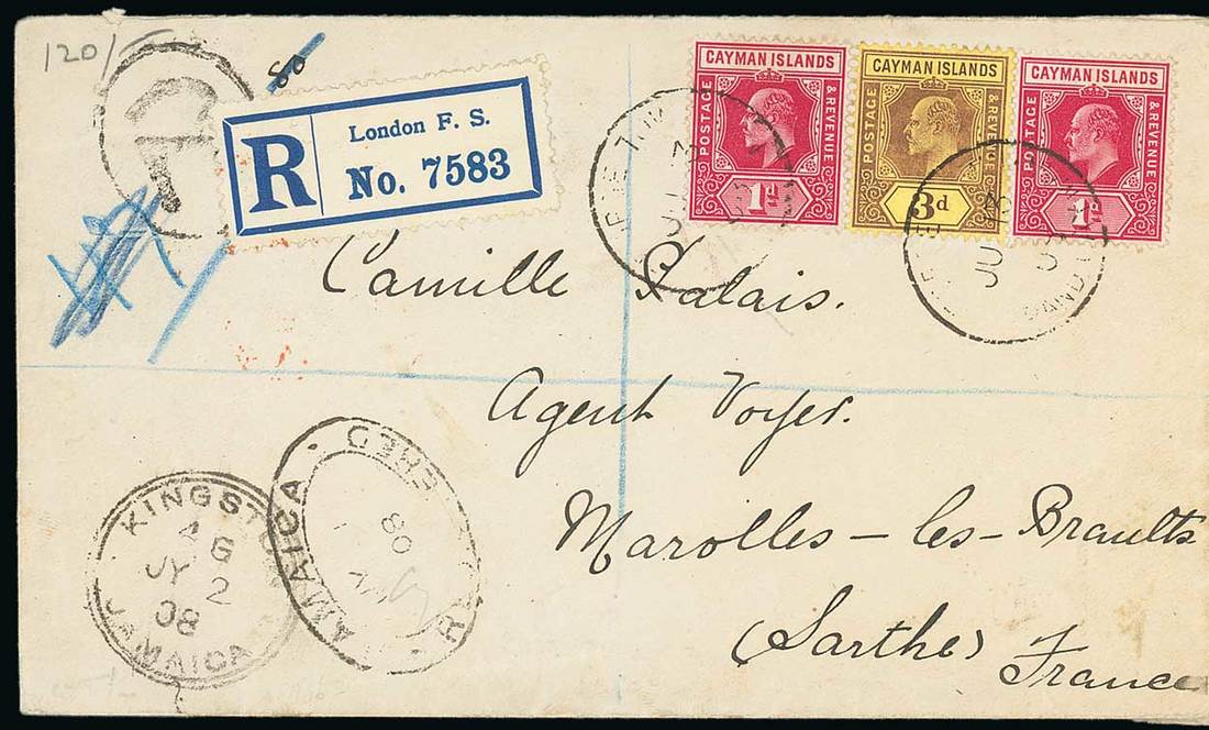 1908 (9 July) envelope (224x97mm.) registered to Boston Mass., bearing twenty-eight examples (three on reverse) of 1908 ¼d., all cancelled by "george town/grand cayman" c.d.s., showing "R" in oval, Mobile transit registration label and, on reverse, Mobile (21.7) and arrival (24.7) datestamps. A most remarkable franking. Photo
