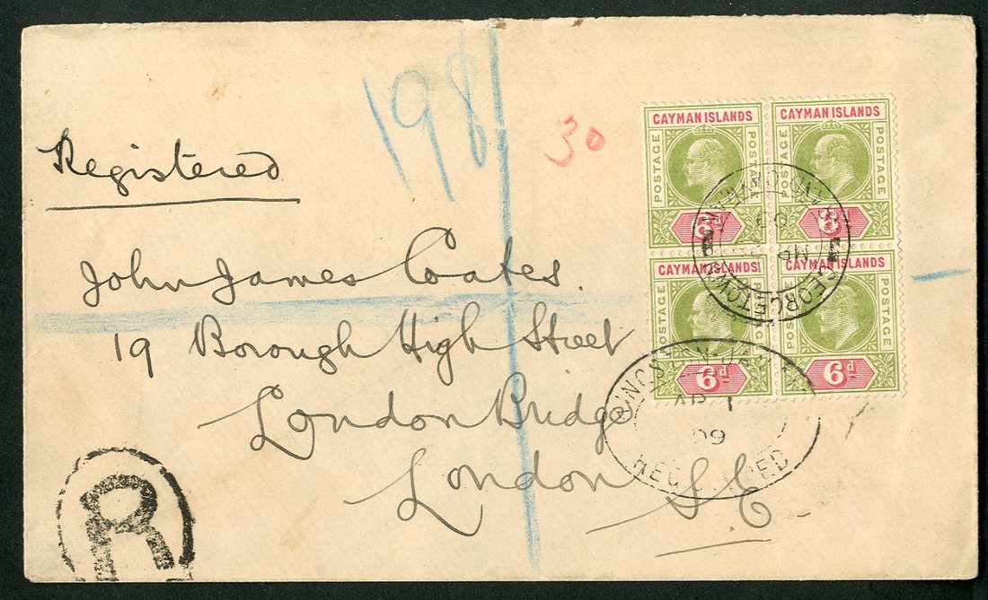 1909 (28 Mar.) envelope registered to London, bearing 1907 (Mar.) 6d. block of four, centrally cancelled by "georgetown/grand cayman" double-ring d.s. and tied by Kingston Registered transit d.s. (1.4), showing "R" in oval with, on reverse, U.S. Sea Post (10.4) and arrival (17.4) datestamps. Photo
