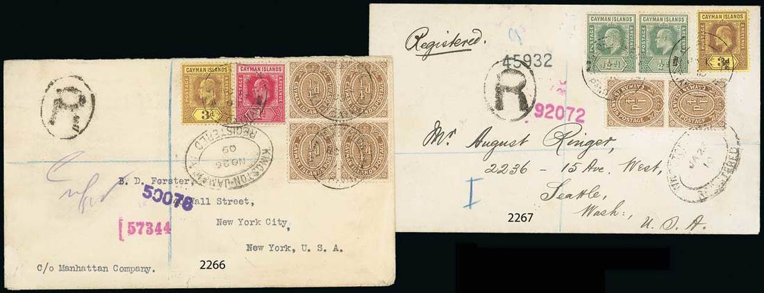 1910 (10 Jan.) envelope registered to Seattle, bearing 1907-09 ½d. pair, 3d. and 1908 ¼d. vertical pair, all tied by "georgetown/grand cayman" double-ring d.s., showing "R" in oval, Kingston Registered transit d.s. (15.1) with light arrival datestamp (5.2) on reverse. A neat and attractive franking. Photo