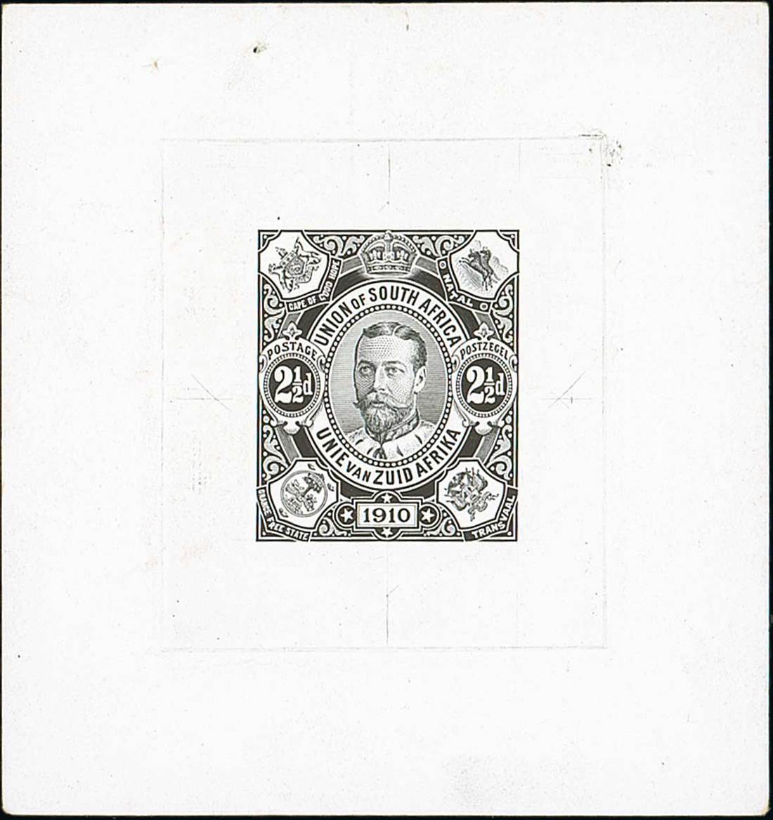 1910 Opening of Union Parliament, 2½d. die proof in black on surfaced wove paper (42x48mm.) with guide lines and die sunk on thin card (73x77mm.); fine. Photo