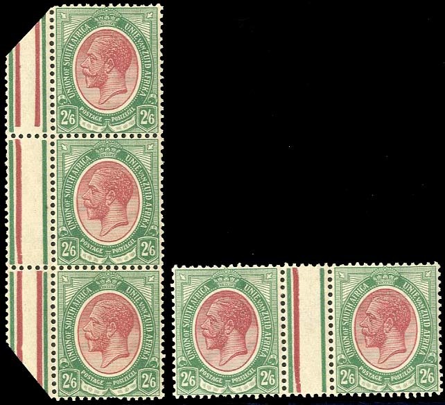 2/6d. purple and green vertical strip of three with interpanneau margin (corners champhered) at left, and an interpanneau pair, both with variety missing Jubilee line, mint; gum a little toned and the strip with a gum crease