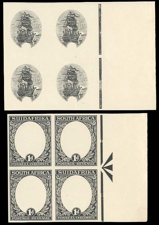 1d. frame and vignette in black, both in marginal blocks of four from the right of the sheet, the frame showing "arrow" in margin; fine
