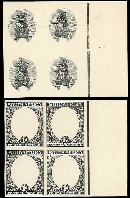 1d. frame and vignette in black, both in marginal blocks of four from the right of the sheet; both with the upper pair having a light bend