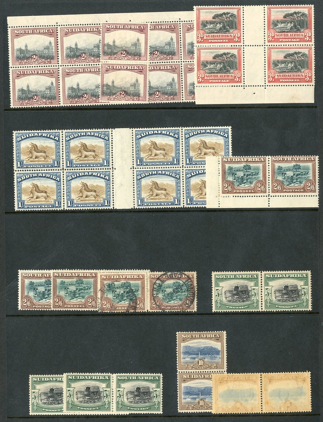 A selection with 2d. interpanneau marginal block of eight from the top of the sheet, 2d. vertical pair with vignettes misplaced to lower left, 3d. interpanneau marginal block of four from the foot of the sheet, 1/- interpanneau block of eight without gum from the Bradbury, Wilkinson archives, 2/6d. (3), 5/- (3) and 10/- horizontal pairs and 10/- vertical pair, mint, and 2/6d. horizontal pair used; a few small faults in places