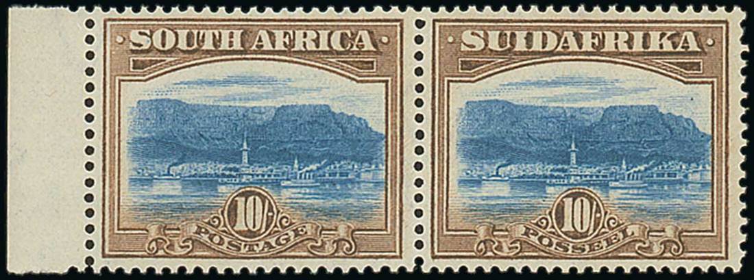 10/- bright blue and brown horizontal marginal pair, variety aniline head plate, fine unmounted mint. Scarce. PFSA Certificate (1993). S.G. 39b, var. Photo