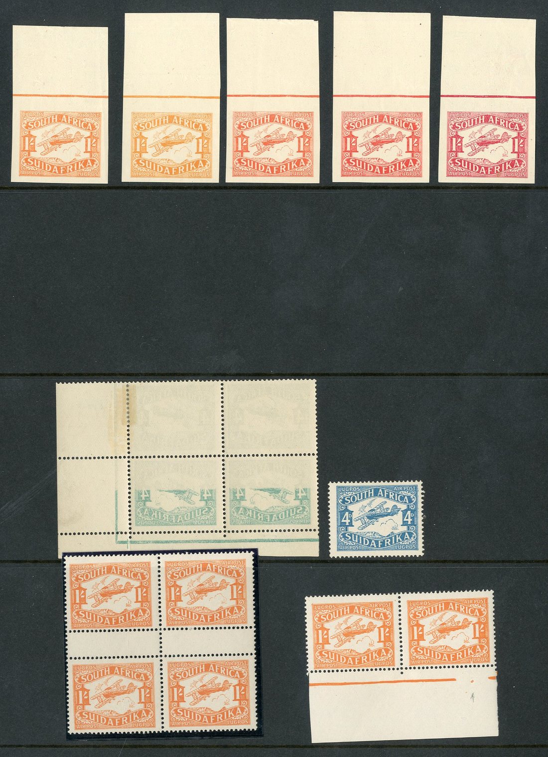1/- plate proofs in orange-yellow, orange, orange-vermilion, carmine and bright rose, all marginal and printed on the reverse of obsolete government land charts, issued 4d. corner block of four with the lower pair with half the design offset, 4d. colour changeling to blue, 1/- interpanneau block of four and a marginal pair, fine mint