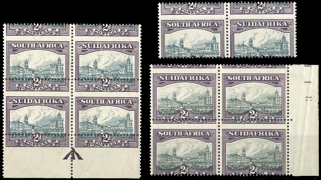 2d. slate-grey and lilac marginal "arrow" block of four, marginal block of four with part sheet number (crease in margin) and a horizontal pair, all from issue 3 with misplaced horizontal perforations, the "arrow" block and the pair by 7mm., the other block by 3mm., fine mint