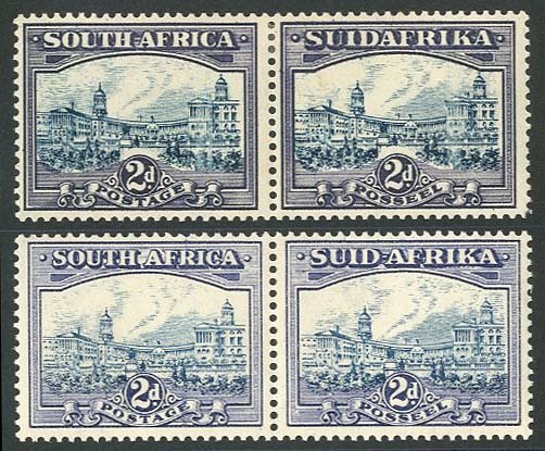 2d. blue and violet horizontal pairs (2) in contrasting shades, mint; one with a hinge remainder. S.G. 44e, £700
