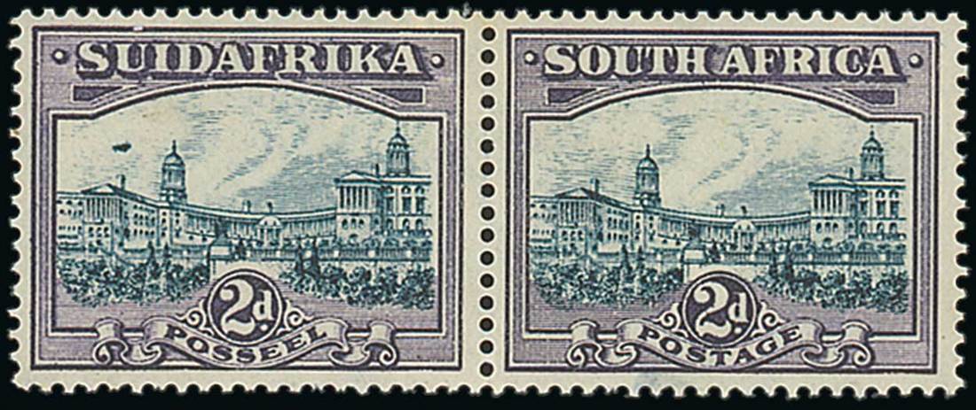 2d. blue and violet horizontal pair, the Afrikaans stamp with airship flaw, fine mint. Scarce. S.G. 44ea, £950. Photo